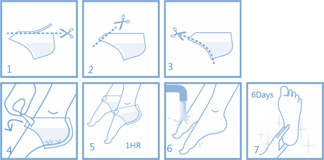 使用過的足膜千萬不可以重複使用,因為腳上可能會有一些細菌留在足膜內,跟空氣接觸之後,有可能造成一些的汙染, 所以開封後也要立刻使用。